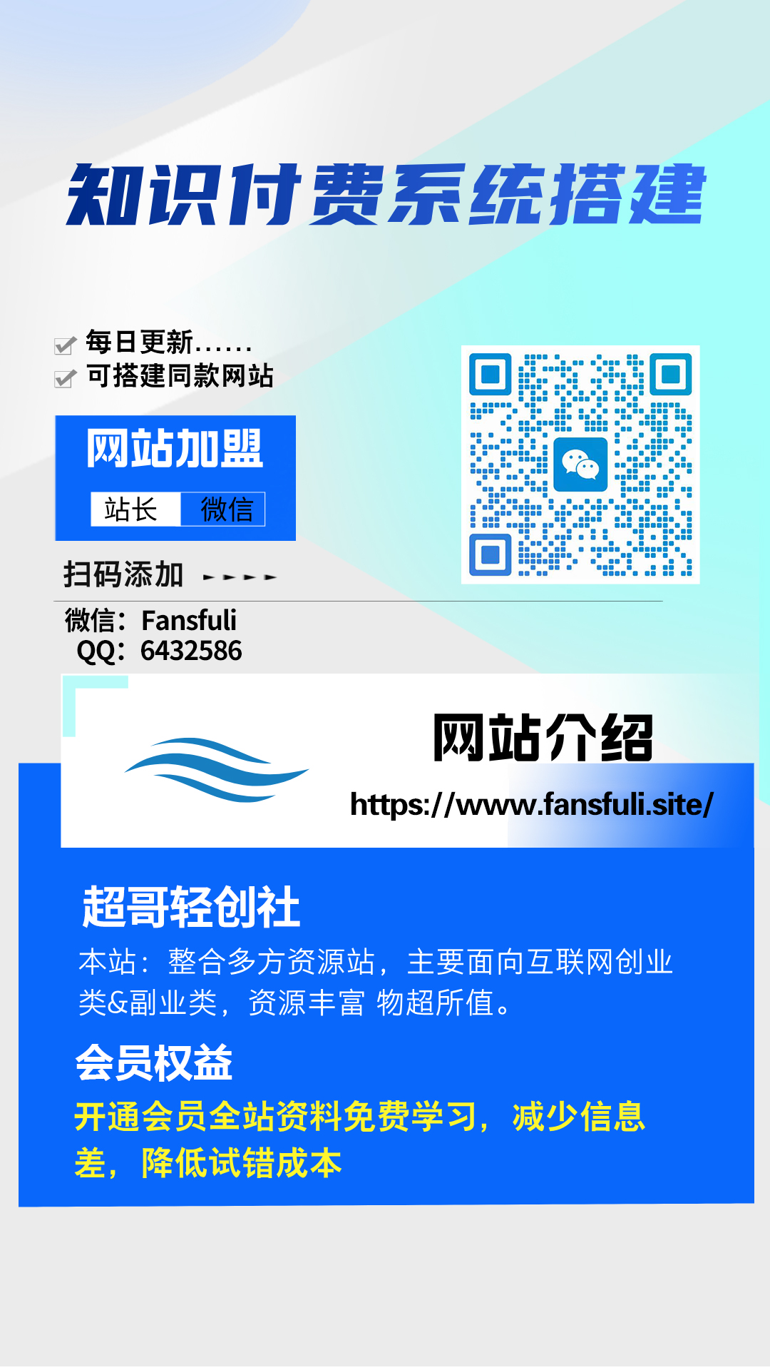加盟超哥轻创社,加盟搭建同款知识付费资源网站,实现长期稳定被动收入~
